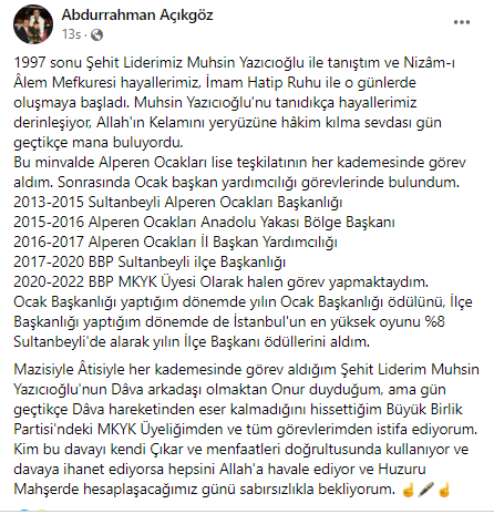 Büyük Birlik Partisi ve Alperen Ocaklarında görev almış olan ve yılında BBP MKK Üyesi olarak seçilen Abdurrahman Açıkgöz dün gece saatlerinde sosyal medya hesaplarından yaptığı paylaşım ile istifasını duyurdu. Açıkgöz, yaptığı paylaşımında, ” Dâva hareketinden eser kalmadığını hissettiğim Büyük Birlik Partisi’ndeki MKYK Üyeliğimden ve tüm görevlerimden istifa ediyorum.” dedi.