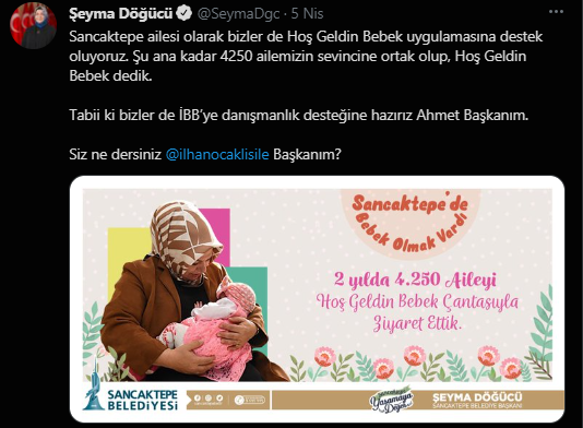 Sancaktepe Belediye Başkanı Şeyma Döğücü: “Sancaktepe ailesi olarak bizler de ‘Hoş Geldin Bebek’ uygulamasına destek oluyoruz. Şu ana kadar 4 bin 250 ailemizin sevincine ortak olup, Hoş Geldin Bebek dedik. Tabii ki bizler de İBB’ye danışmanlık desteğine hazırız Ahmet Başkanım. Siz ne dersiniz İlhan Ocaklı başkanım?”