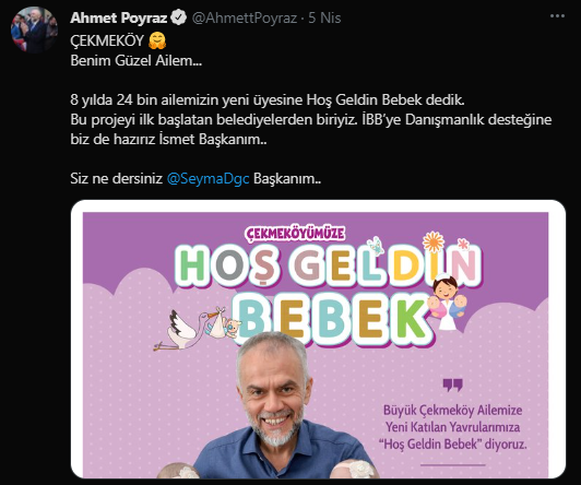 Çekmeköy Belediye Başkanı Ahmet Poyraz ise; “Çekmeköy. Benim Güzel Ailem… 8 yılda 24 bin ailemizin yeni üyesine ‘Hoş Geldin Bebek’ dedik. Bu projeyi ilk başlatan belediyelerden biriyiz. İBB’ye Danışmanlık desteğine biz de hazırız İsmet Başkanım.. Siz ne dersiniz Şeyma Döğücü Başkanım..”