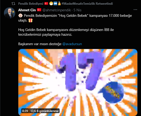 Pendik Belediye Başkanı Ahmet Cin, “Pendik Belediyemizin “Hoş Geldin Bebek” kampanyası 17.000 bebeğe ulaştı. Hoş Geldin Bebek kampanyasını düzenlemeyi düşünen İBB ile tecrübelerimizi paylaşmaya hazırız. Başkanım var mısın desteğe Abdurrahman Dursun.”