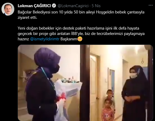Bağcılar Belediye Başkanı Lokman Çağırıcı da; “Bağcılar Belediyesi son 10 yılda 50 bin aileyi ‘Hoşgeldin Bebek’ çantasıyla ziyaret etti. Yeni doğan destek paketi hazırlamayı ilk defa hayata geçecek bir proje gibi anlatan İBB’yle, biz de tecrübelerimizi paylaşmaya hazırız. Haydar Ali Yıldız başkanım var mısın sen de desteğe?”