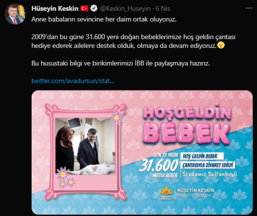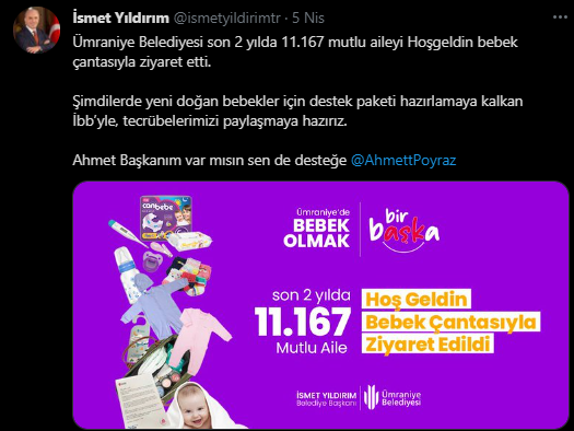 Ümraniye Belediye Başkanı İsmet Yıldırım da; “Ümraniye Belediyesi son 2 yılda 11 bin 167 mutlu aileyi ‘Hoşgeldin bebek’ çantasıyla ziyaret etti. Şimdilerde yeni doğan bebekler için destek paketi hazırlamaya kalkan İBB’yle, tecrübelerimizi paylaşmaya hazırız. Ahmet Başkanım (Ahmet Poyraz) var mısın sen de desteğe?”