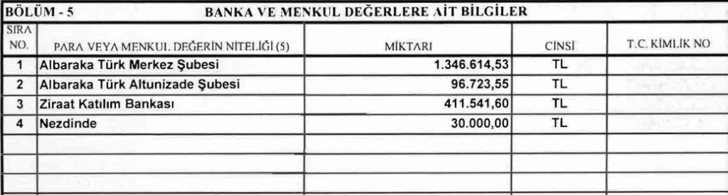 Buna göre Cumhurbaşkanı Erdoğan’ın iki tanesi Al Baraka Türk, bir tanesi de Ziraat Katılım Bankası ve ‘nezdinde’ başlığıyla toplam 4 ayrı hesapta 1 milyon 883 bin lirası bulunuyor. Mal varlığı tablosunda Mustafa Erdoğan’a ise 5 milyon 390 bin liralık borcu görünüyor.