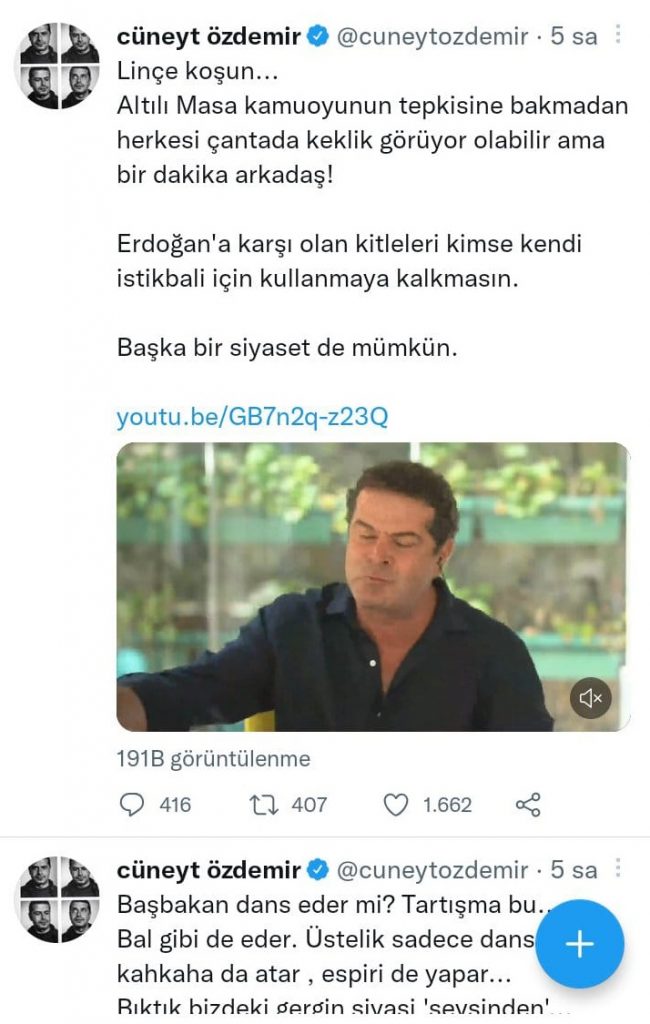 BARIŞ DURAK / Gazeteci Cüneyt Özdemir, Twitter hesabından yaptığı paylaşımda 6’lı masaya tepki göstererek, “Linçe koşun… Altılı Masa kamuoyunun tepkisine bakmadan herkesi çantada keklik görüyor olabilir ama bir dakika arkadaş! Erdoğan’a karşı olan kitleleri kimse kendi istikbali için kullanmaya kalkmasın. Başka bir siyaset de mümkün” dedi.