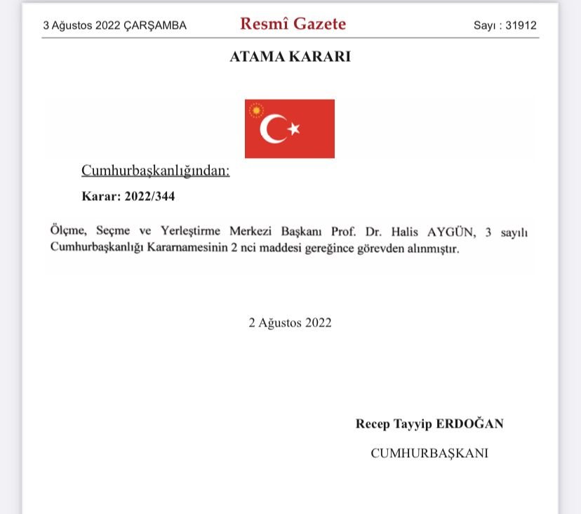 Cumhurbaşkanı Recep Tayyip Erdoğan imzalı kararname ile ÖSYM Başkanı Prof. Dr. Halis Aygün görevden alındı.