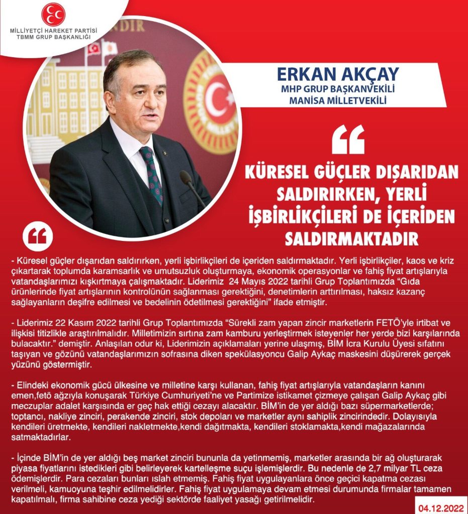 “Liderimiz 22 Kasım 2022 tarihli Grup Toplantımızda “Sürekli zam yapan zincir marketlerin FETÖ’yle irtibat ve ilişkisi titizlikle araştırılmalıdır. Milletimizin sırtına zam kamburu yerleştirmek isteyenler her yerde bizi karşılarında bulacaktır.” demiştir.