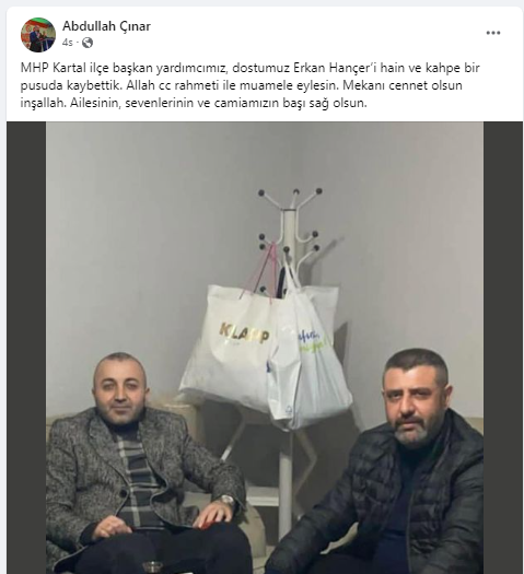 MHP Kartal İlçe Başkan Yardımcısı Erkan Hançer, 27 Eylül’de Sancaktepe’de marketten çıktığı esnada silahlı saldırıya uğradı. Yaralanan Erkan Hançer, tedavi gördüğü hastanede yaşama yenik düştü.