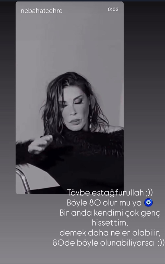 Nebahat Çehre, çok konuşulan açıklamasının ardından Instagram hesabından yaptığı paylaşım ile dikkat çekti. Siyah-beyaz filtre ile çekilen bir fotoğrafını yayınlayan Çehre, paylaşımına “Tövbe estağfurullah. Böyle 80 olur mu ya? Bir anda kendimi çok genç hissettim, demek daha neler olabilir, 8O’de böyle olunabiliyorsa” notunu düştü.