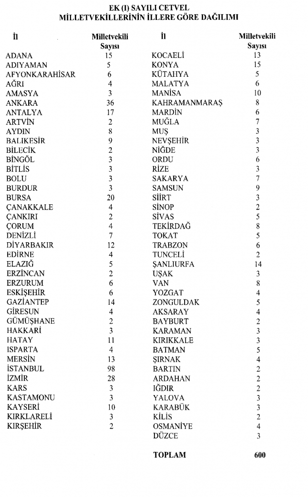 Yüksek Seçim Kurulu’nun Resmi Gazete’de yayımlanan kararına göre; TÜİK verilerinden hareketle hangi ilden kaç milletvekilinin çıkacağı belirlendi. 600 milletvekili