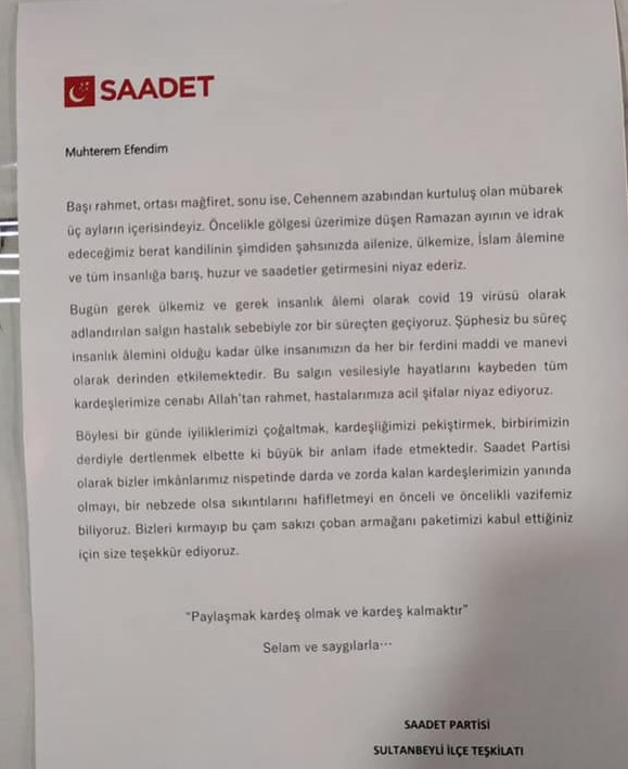 Ramazan ayı sebebiyle Saadet Partisi Sultanbeyli İlçe Başkanlığı tarafından koronavirüs pandemisi nedeniyle gelir kaybı yaşayan ve dar gelirli ailelere ulaştırılmak üzere erzak kolileri hazırlandı. Yardım kolilerinin ihtiyaçlı ailelere ulaştırıldığını duyuran İlçe Başkanı Fetullah Bülbül, “Sosyal İşler Başkanlığımızın organize ettiği “Gıda Paketlerini” Mahalle teşkilatlarımız aracılığı ile Sultanbeyli’deki komşularımıza ulaştırdık. Katkısı olanlardan Allah razı olsun…” dedi.