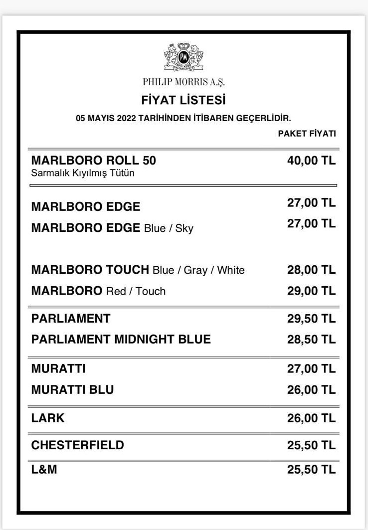 5 Mayıs Perşembe günü sigara fiyatlarına yapılan yeni zamla beraber, sigara fiyatları araştırılmaya başladı. İşte Marlboro, Lark, L&M, Kent, Parliament, Muratti, Winston, Tekel sigara markalarının yeni fiyatları!