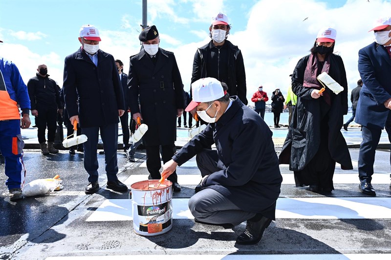 Vali Yerlikaya ve beraberindeki heyet, trafikte yaya güvenliğine dikkat çekmek amacıyla yaya geçidini kırmızıya boyadı.